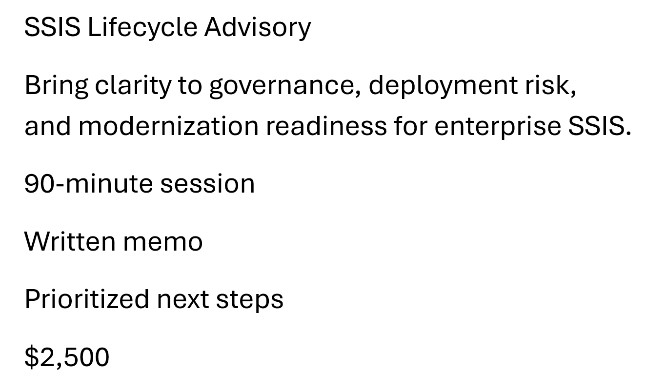 The SSIS Lifecycle Advisory is a fixed-scope engagement designed to help your team identify where friction, risk, and hidden cost are accumulating in your current SSIS delivery model — and what to do next.